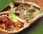 ・グリルケバブミート・トマト・オニオンスライスを挟んで出来上がり。